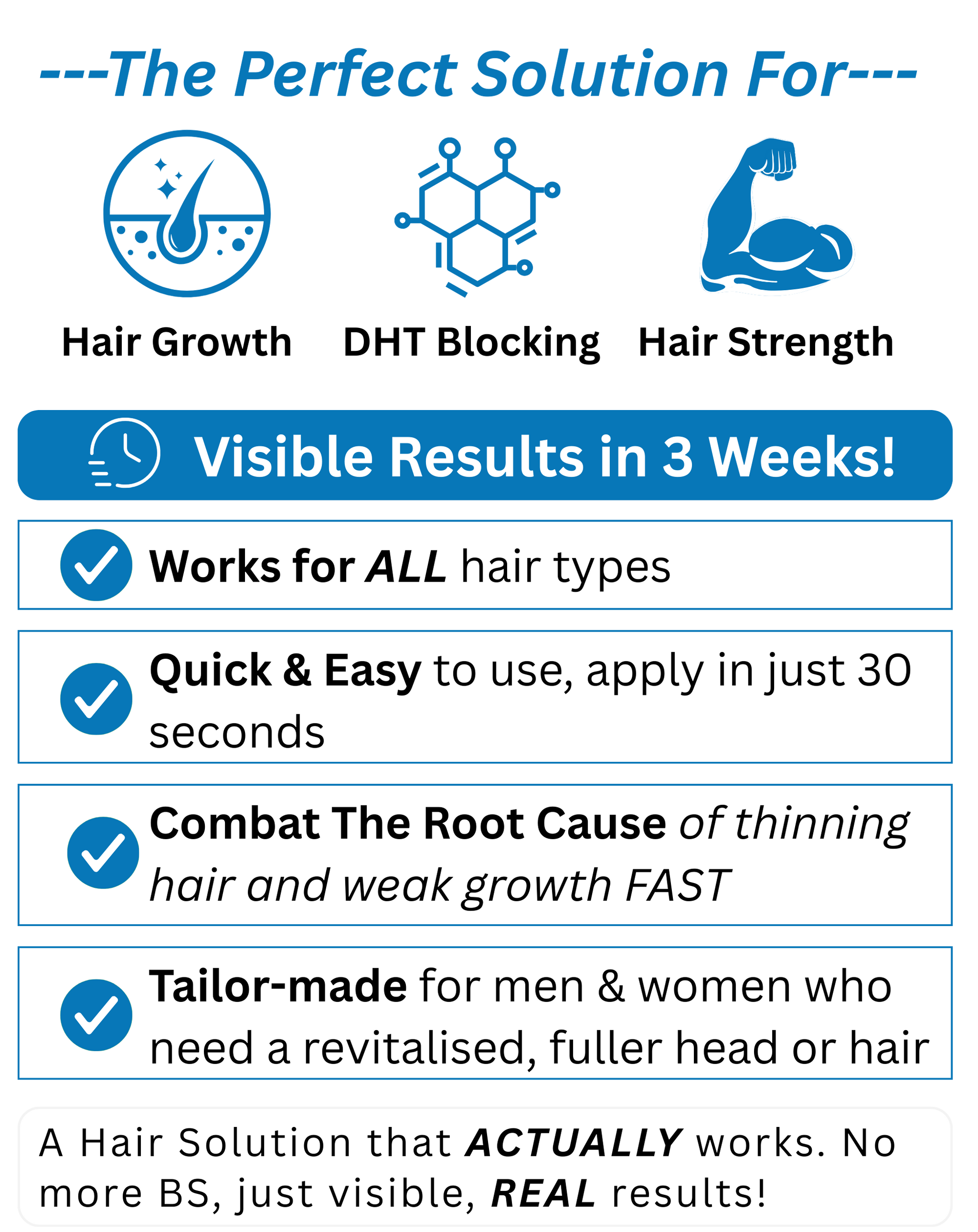 Our roll-on serum is powered by Tri-Act Follicle Technology™, a breakthrough blend of Redensyl, Anagain, and Rosemary Extract that works deeper — targeting dormant follicles, boosting oxygen and nutrient delivery, and gently balancing DHT levels directly at the scalp.